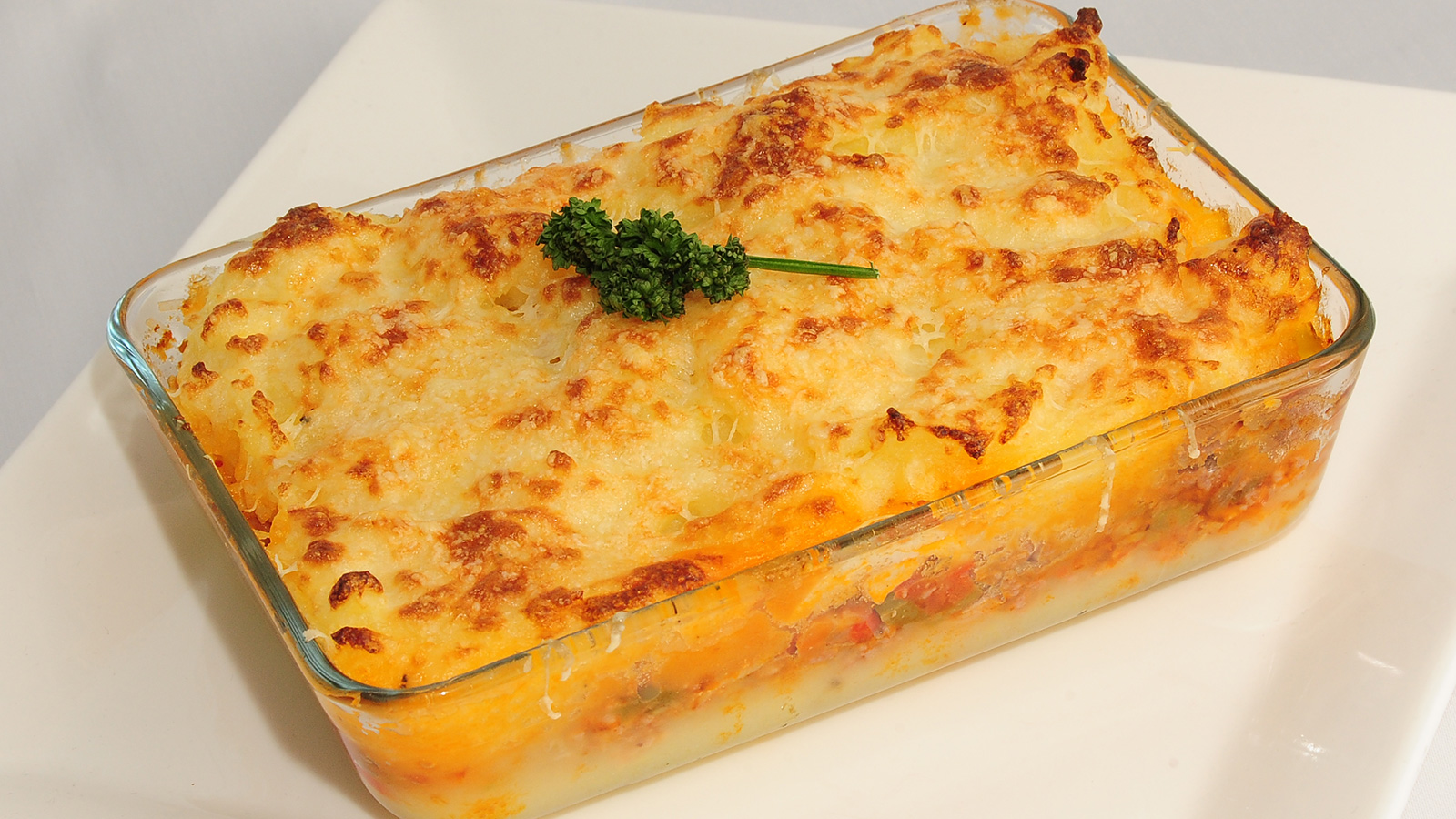 El secreto está en el puré: bien batido, con manteca, leche y nuez moscada. Se arma en capas, se lleva al horno con queso rallado o cubitos de manteca por encima, y se gratina hasta que la superficie diga: comeme ya.
